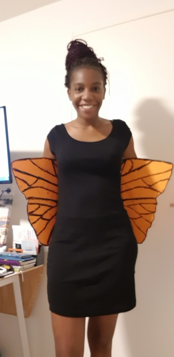 25th September 2020 Inspiration: I was listening to one of my favourite songs, Butterfly by Crazy Town, and decided to be a butterfly. Step 1: Use kajal to draw lines on orange paper. Step 2: Stick butterfly wings on black dress. Step 3: Dance time. https://videopress.com/v/bpma9vpL?preloadContent=metadata Song Credit: https://www.youtube.com/watch?v=6FEDrU85FLE